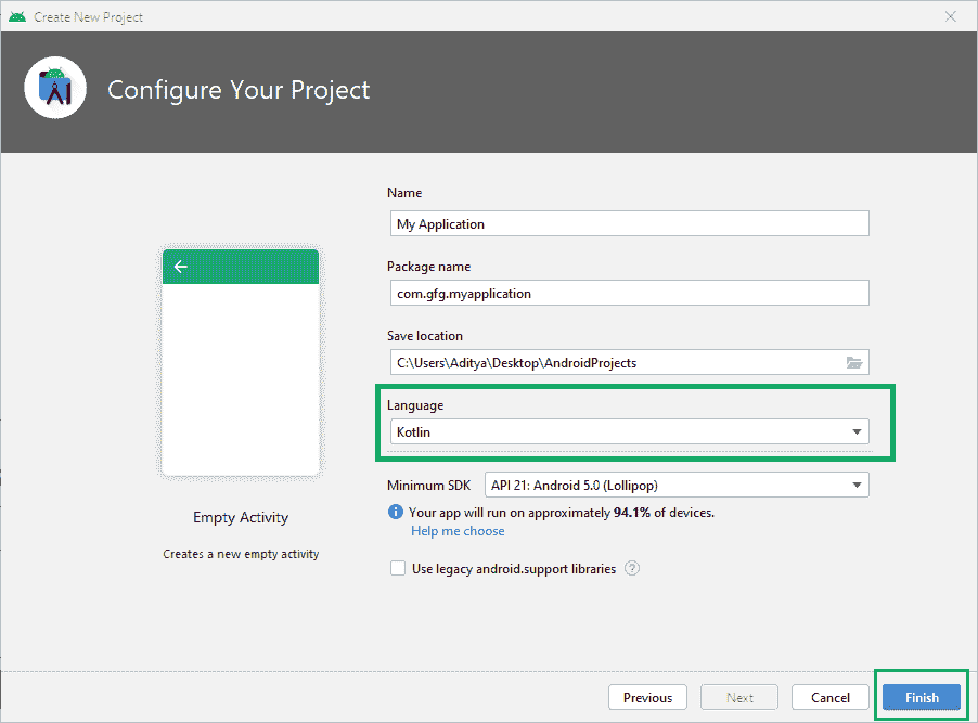 - 最小 SDK (标注这个词) : 大家知道,安卓定期发布版本,他们在最新版本中提供了一些老版本不支持的新功能。所以你要选择你想打哪个用户群。假设你选择“API 21: Android 5.0(棒棒糖)”,那么你可以看到“你的应用将在大约 94.1%的设备上运行”。否则,你也可以点击“帮我选择”按钮。