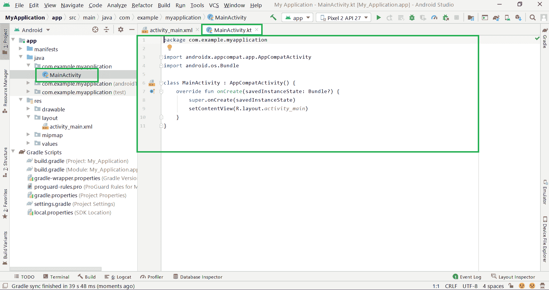 注意:如果在项目创建时选择语言为 Java ,那么文件名为MainActivity.java。