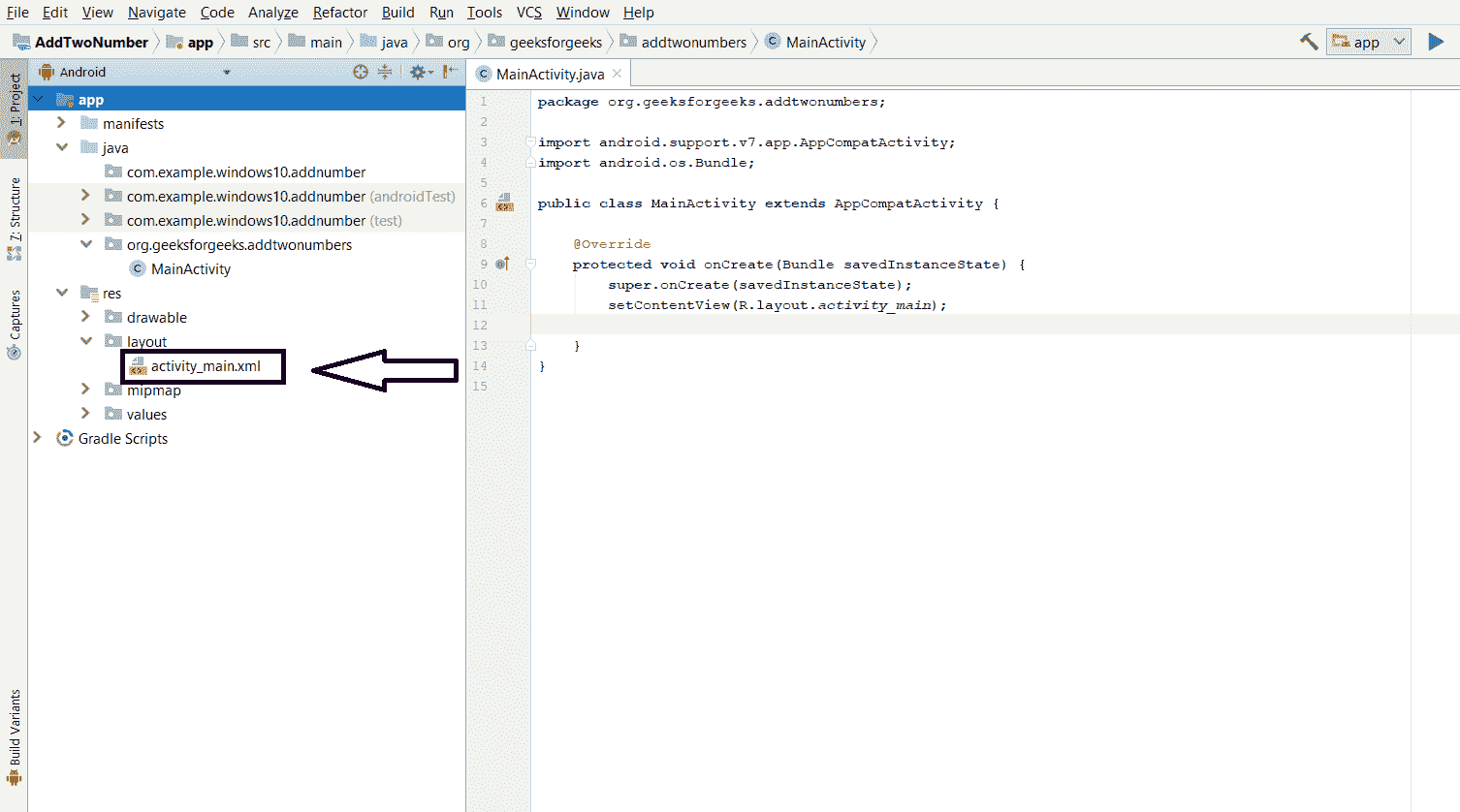 正如我们对设计部分的理解一样,另一个主要部分是编码部分。在下图中,您可以看到一个名为 MainActivity.kt 的文件。是的,这是您编写后端部分的文件。逻辑部分。例如,您想要添加两个数字。因此,在编辑文本中输入两个数字后,当用户点击按钮时,它会给出两个数字之和的输出。所以要计算总和,你必须把逻辑写在它的部分。