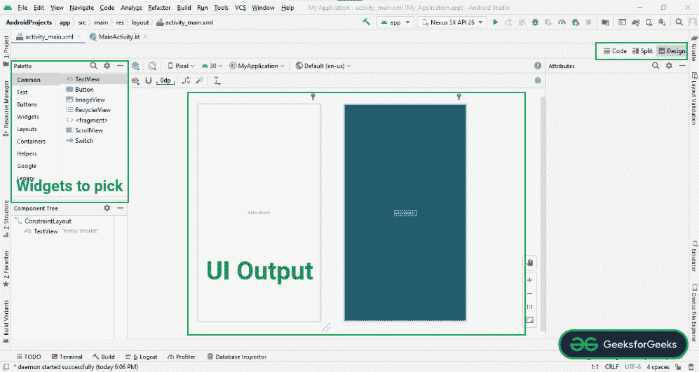 应用程序的所有用户界面布局都可以在 res/layout 目录下找到。这些是。xml 扩展,负责为应用程序构建 UIs。安卓工作室为应用程序提供了两种设计用户界面的方式。一个是文本,需要通过硬编码设计 UI,一个是设计部分,为构建 UI 提供了便捷的拖拽机制。请看下面的图片,它显示了代码是如何编写的,它继续在右窗格中显示结果。