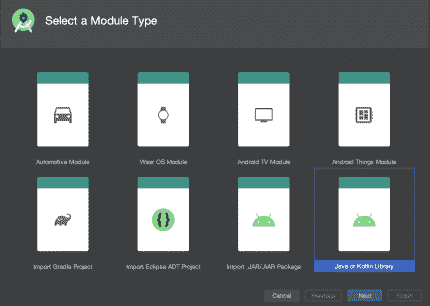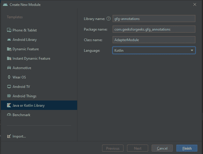 第一步是构建一个新的模块来容纳您的注释。转到安卓工作室,然后点击 文件- >新建- >新建模块,然后选择科特林,之后,你需要像通常对你的安卓项目一样给模块添加一个名称。