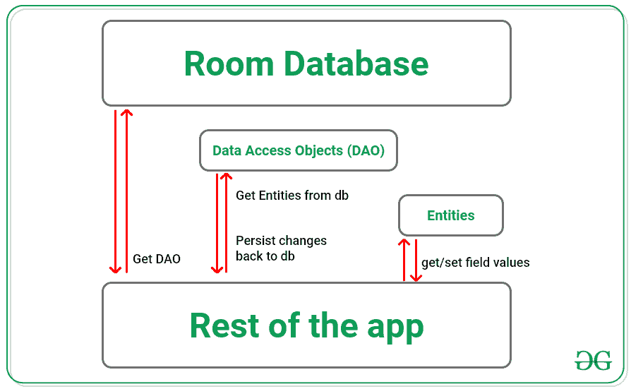 在浏览了房间图书馆的各个组成部分后,我们对每个组成部分是如何单独工作的以及它们的作用有了一个概念。在此基础上,我们有了代表它们功能的插图。我们可以看到我们获取的 Room Database 实例是用来访问 Dao 的,Dao 反过来拥有所有的查询功能和对实体的控制。通过使用这些实体来获取和设置数据,正如在 Dao 中通过查询所提到的,数据是持久化的。