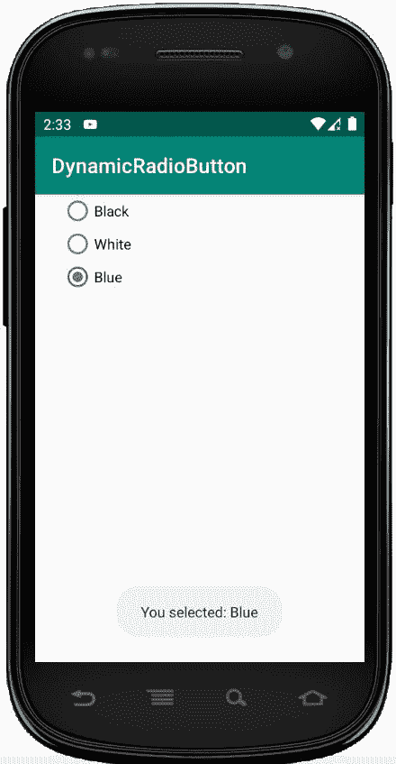 然后,使用代码将它们使用到 RadioGroup 中: