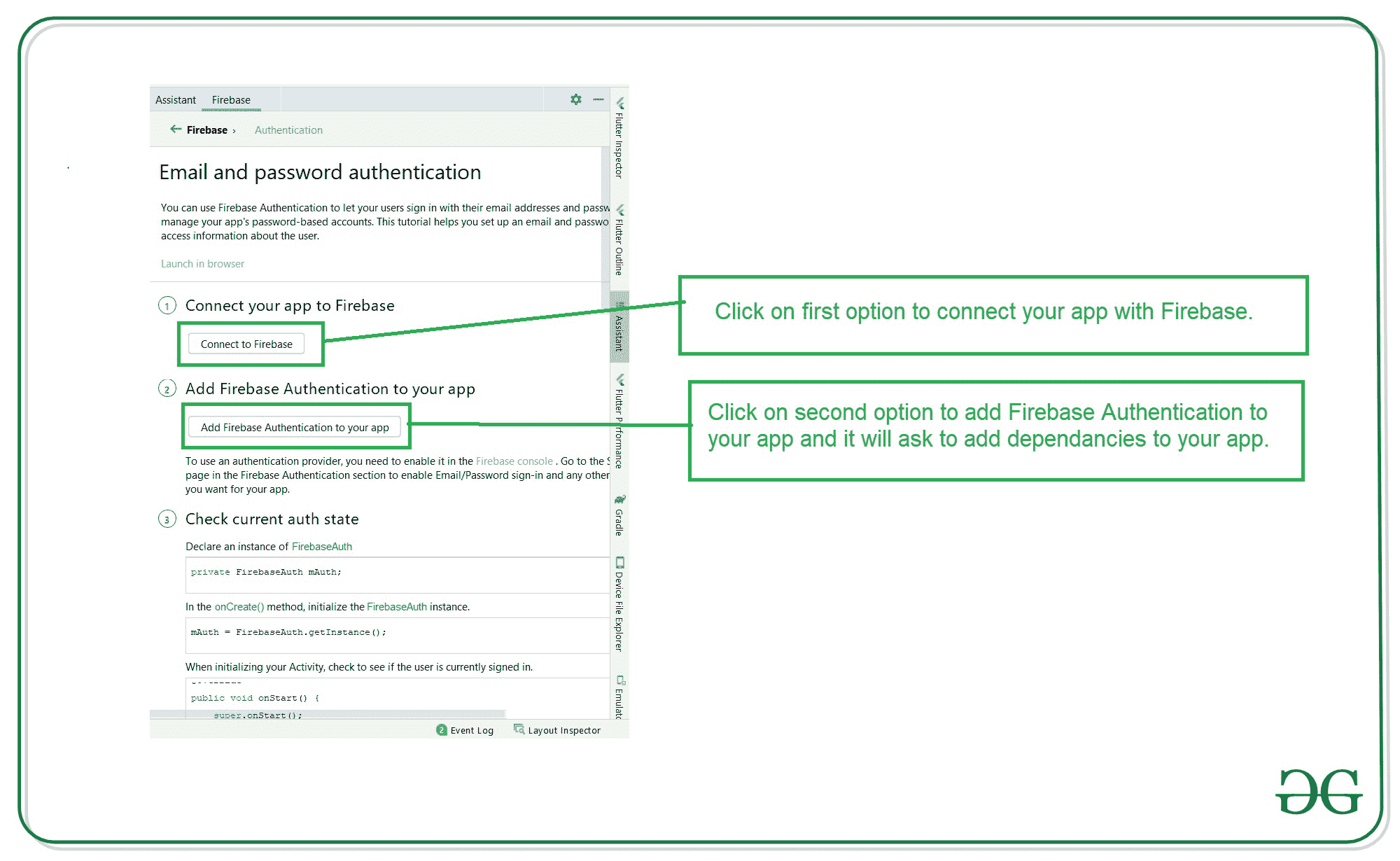 点击电子邮件和密码认证后,您将看到下面的屏幕。在此屏幕中,单击第一个选项连接到 firebase,然后单击第二个选项将 Firebase 身份验证添加到您的应用程序中。