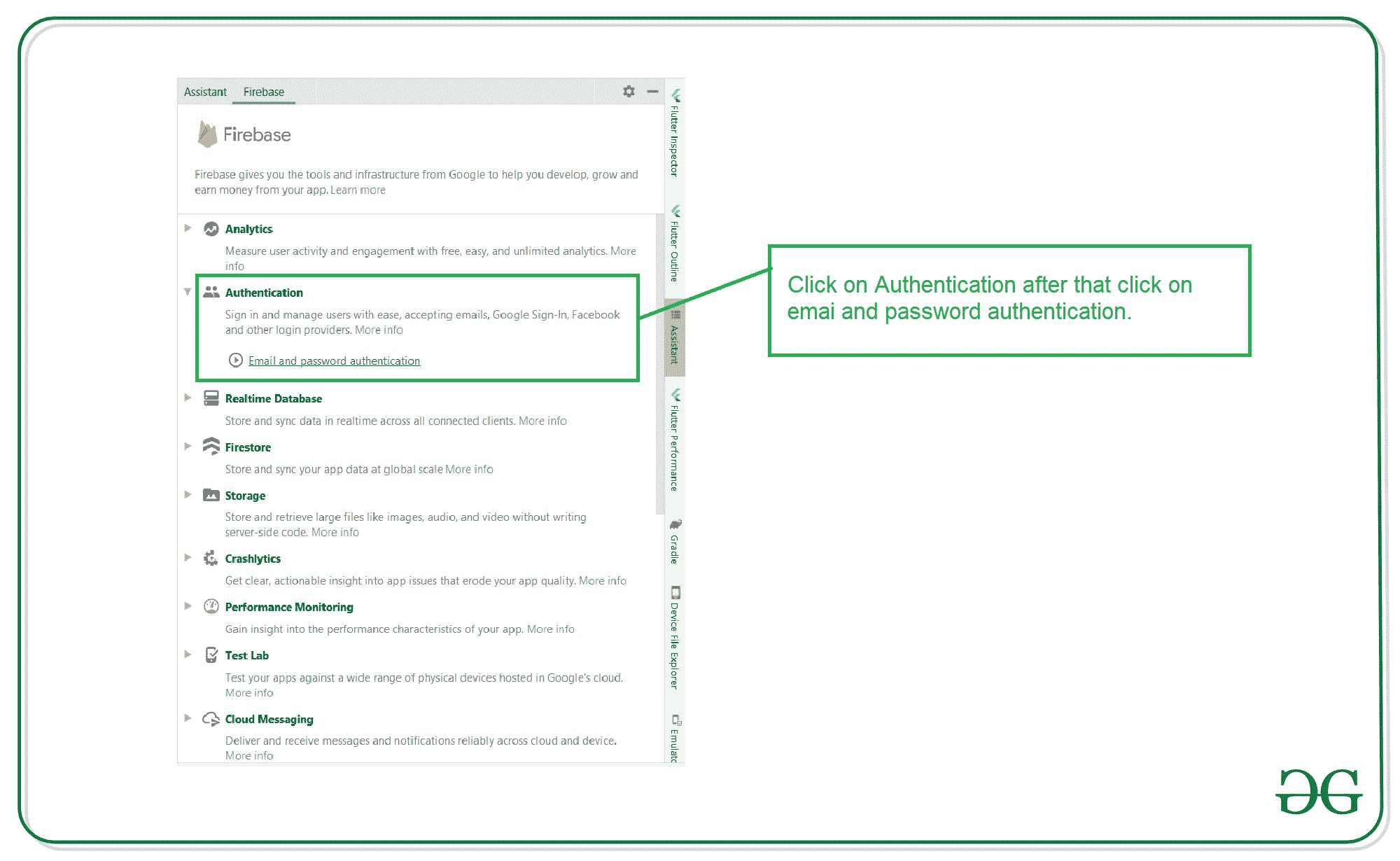 在 Android Studio 中创建新项目后。将您的应用程序连接到 Firebase。用于将您的应用程序连接到 firebase。导航到顶部栏上的工具。之后点击 Firebase。右侧将打开一个新窗口。在该窗口中,单击身份验证,然后单击电子邮件和密码身份验证。