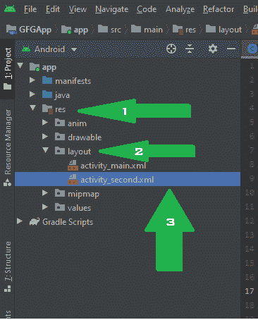 转到,RES/layout/activity _ second,粘贴下面的代码。这里,我们使用带有按钮的约束布局来切换到另一个活动。