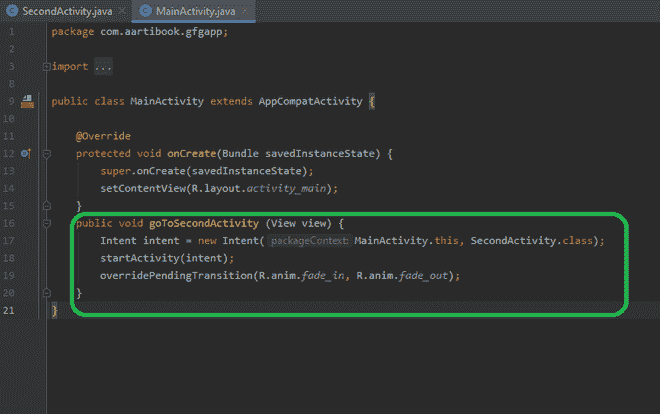 只需在 onCreate() 方法后的 MainActivity 类中添加以下代码。这是前往第二活动的代码,我们正在设置两者之间的动画。