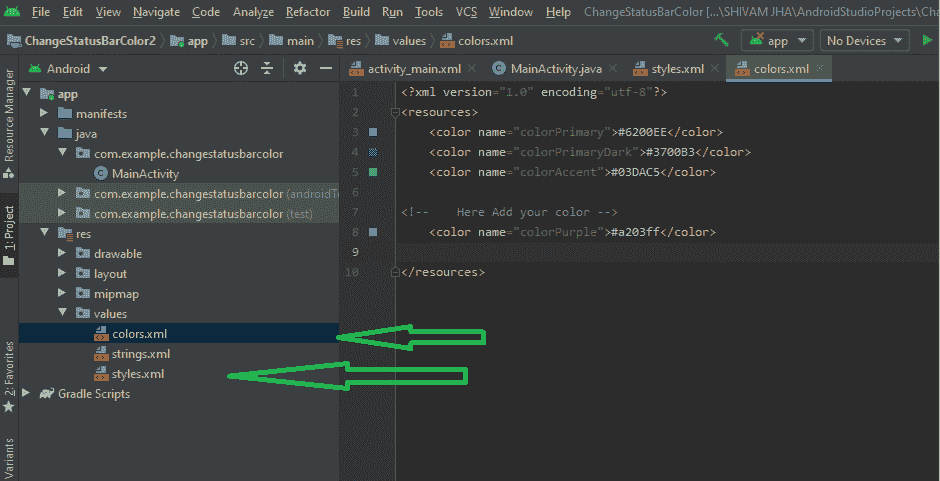 步骤 3: 通过导航 res/values/colors.xml 找到另一个 XML 文件,并在此添加您想要为状态栏更改的颜色。