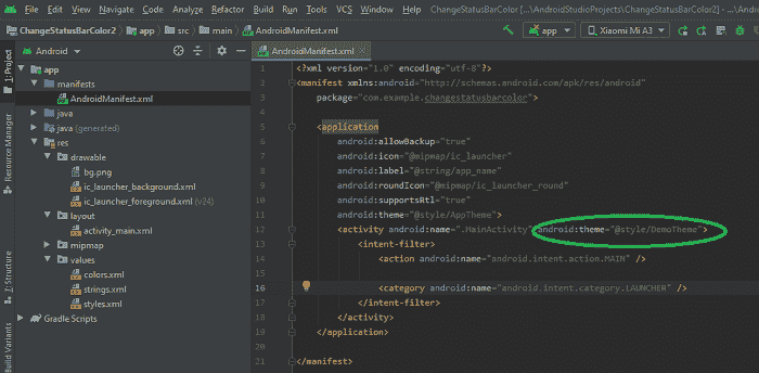 第 6 步:现在转到 manifest/AndroidManifest.xml,在这里搜索要应用该主题或更改状态栏颜色的活动。并添加一个属性 Android:theme = " @ style/Democheme "。