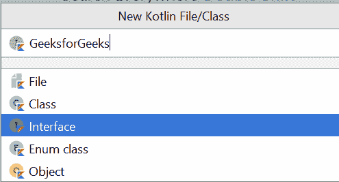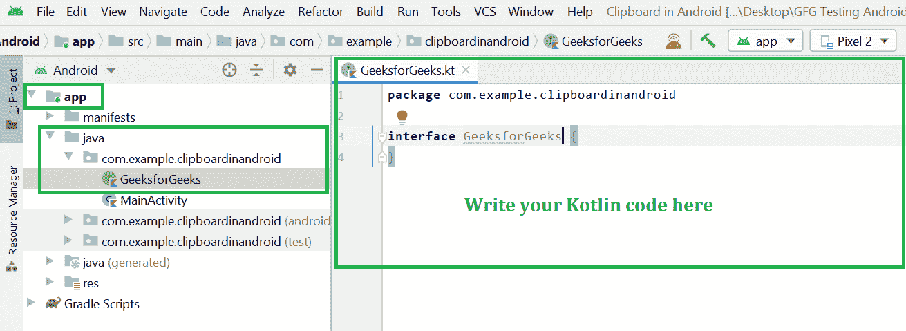 成功完成以上步骤后,您可以在这里找到您的科特林课程。去 app > java >你的包名> GeeksforGeeks.kt. 你可以在这里自己写 Kotlin 代码。