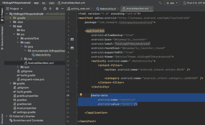 第 7 步:转到 MainActivity.kt,输入下面的代码,从 AndroidManifest.xml 中的元数据中获取 KEY 值