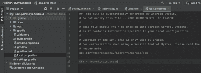 第四步:转到 gradle 文件夹中的 local.properties 文件,声明 API/Secret 密钥