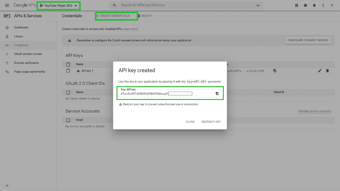 通过访问此链接添加 API 密钥。创建一个新项目,或者选择现有项目,创建一个应用编程接口密钥并保存在某个地方。我们稍后将在代码中使用它。