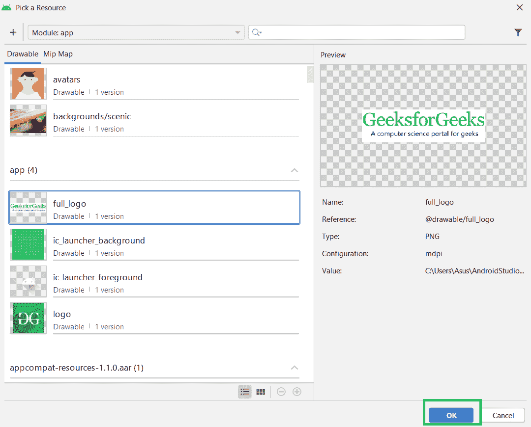 从 Android Studio 添加图像将 ImageView 小部件拖动到应用程序的活动区域,将打开一个弹出对话框,从广泛的可绘制资源中进行选择,然后单击“确定”。