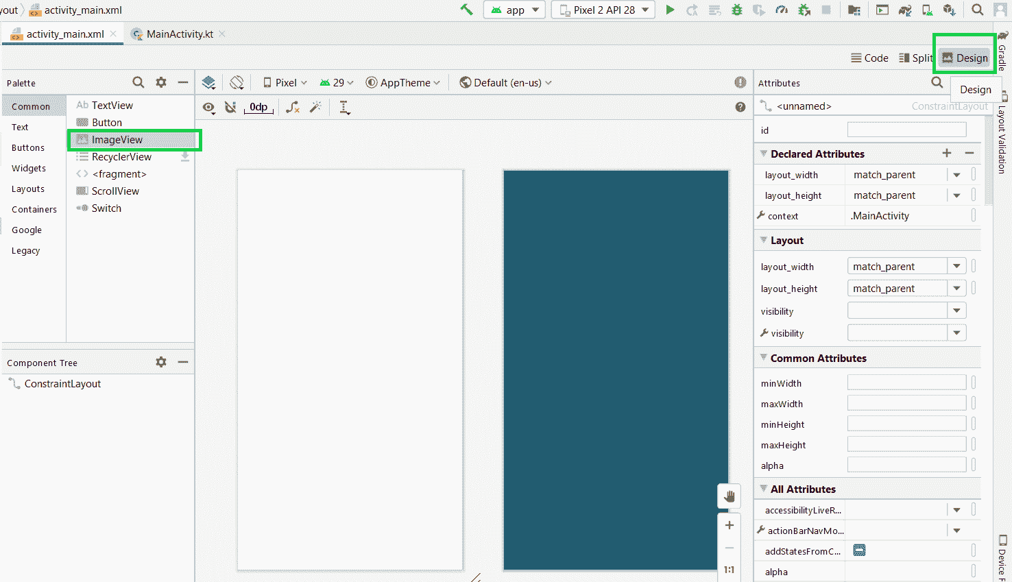 注:以 app:layout_constraint 开头的 ImageView 的所有属性都是固定活动中图像位置的垂直和水平约束。这对于将约束添加到 ImageView 是非常必要的,否则,所有图像将占据活动布局的位置(0,0)。