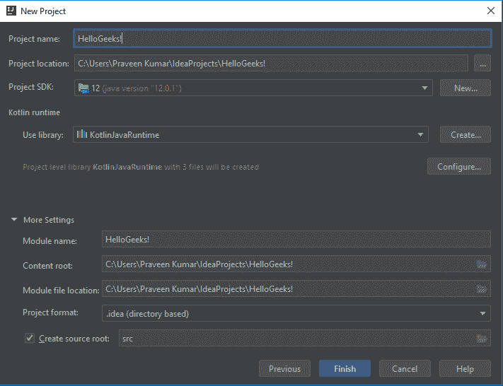 Now you have new project HelloGeeks!. Create a new Kotlin file under the source(src) folder and let’s name it is firstapp.kt