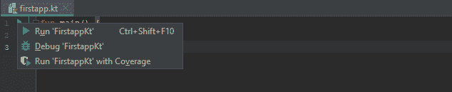 Running the application.Now the application is ready to run. The easiest way is to click the green Run button in the sidebar and select Run ‘FirstappKt’. You can run directly by pressing Ctrl + Shift + F10.