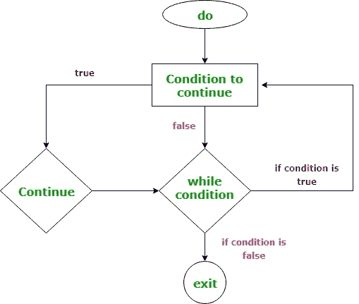在 do-while 中,我们还可以使用未标记的 continue 跳过最近的闭合循环的迭代。这里,我们需要把继续的条件放在做块。如果条件变为假,它将跳过以下指令并将控制转移到 while 条件。 边做边循环中无标记继续的语法-