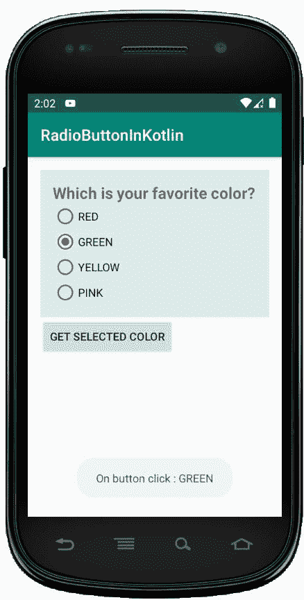 现在,我们将在 kotlin 文件中访问这个小部件,并在选择单选按钮时显示适当的消息。