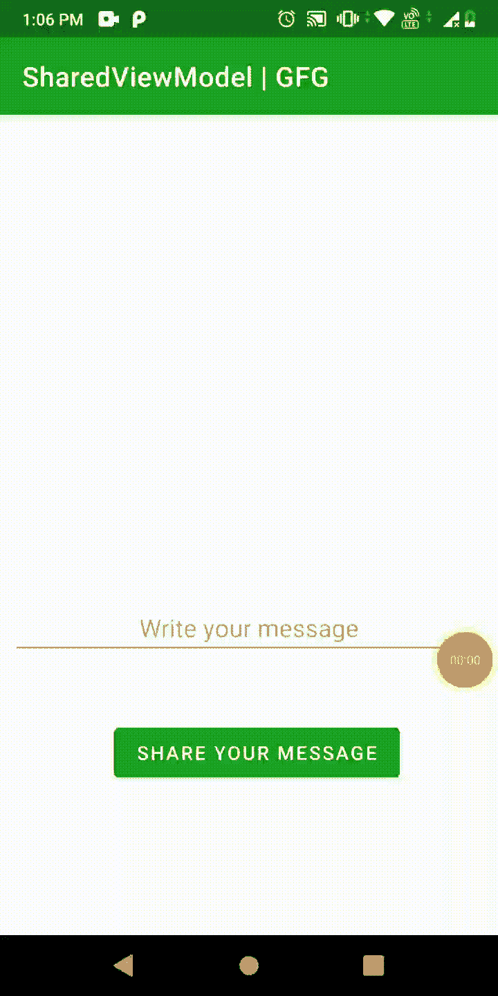 在文章中,我们将学习 Android 中的 Shared ViewModel 来与其他片段进行通信。我们将开发一个包含两个片段的应用程序,其中一个片段更新视图模型中的数据,视图模型在两个片段之间共享,另一个片段观察数据的变化并在屏幕上显示更新的数据。应用程序的工作是发送->接收->显示消息。下面给出了一个示例 GIF,以了解我们将在本文中做什么。