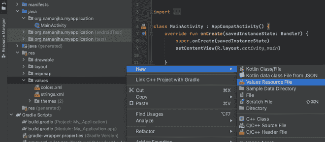 要创建样式文件,请右键单击 res 文件夹中的值文件夹,将光标移动到“新建”,然后单击“值资源文件”。