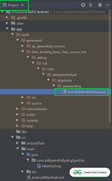 - ActivityMainBinding 类在项目层次结构下的以下路径中生成,可以查看。