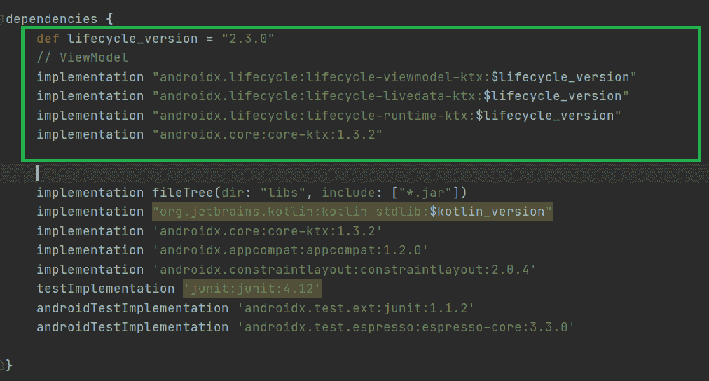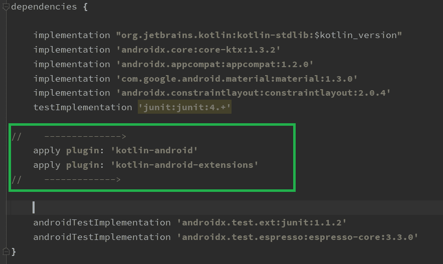 另外,在 build.gradle(Module:app) 文件中添加以下依赖项。我们添加这两个依赖项是因为为了避免在我们的 MainActivity.kt 文件中使用findwiewbyid()。试试这个,否则使用正常方式,如findwiewbyid()。