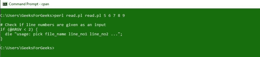 **Filename.pl****File_to_be_read.abc****x y z**这里, Filename.pl 是包含 perl 脚本 File _ to _ be _ read . ABC是要读取的文件的名称。该文件可以是任何类型。文字、脚本等。 x y z 是要打印的行号。