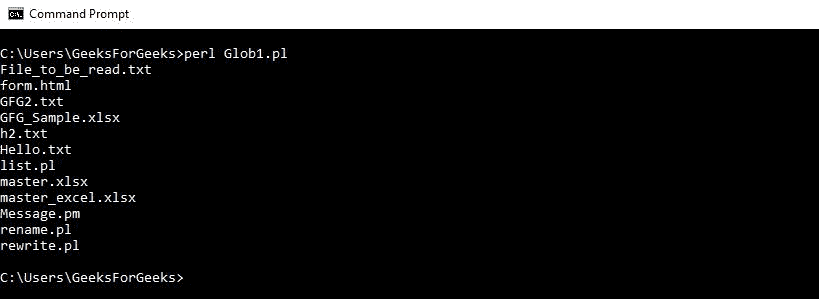 @files = glob('C:/Users/GeeksForGeeks/Folder/*');  foreach \(file (@files) # Loop to run through all files {     print basename(\)file), "\n"; # Print all files }  ```