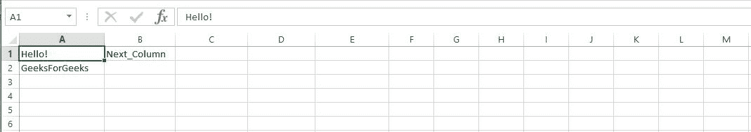 $Excelsheet->write( "A2", "GeeksForGeeks" );