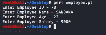 my $sth = $dbh- >准备(“CREATE TABLE EMP _ DETAILS(ID INT PRIMARY KEY,EMP_NAME VARCHAR(50),AGE INT,SALARY INT)”); $ sth->execute();