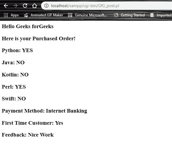 在Perl中,公共网关接口(CGI) 只不过是一个协议,定义了网络服务器与一些可执行程序的交互,以产生动态网页。基本上,它显示了网络服务器如何向程序发送信息,程序如何将信息发送回网络服务器,而网络服务器又可以将信息发送回浏览器。