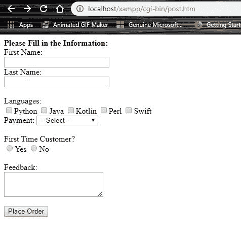 该信息通过 QUERY_STRING 头传递,通过使用**QUERY_STRING**环境变量,可以在您的 CGI 程序中轻松访问。请求字符串中只能有 1024 个字符,因为 GET 方法有大小限制。只需将键值对与任何网址连接起来,就可以传递信息。
