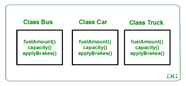 考虑一类车辆。现在我们需要为公共汽车、汽车、卡车等创建一个类。所有车辆的燃油计数()方法、容量()方法、应用制动()方法都是相同的。如果我们在没有继承知识的情况下创建这些类,那么我们可以按照图中所示的方式来做: