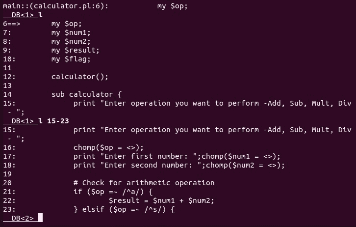 ‘-‘ command : Outputs 10 lines of script before the current line. Suppose that you are current on line 20, then, lines 9 to 19 will be displayed.