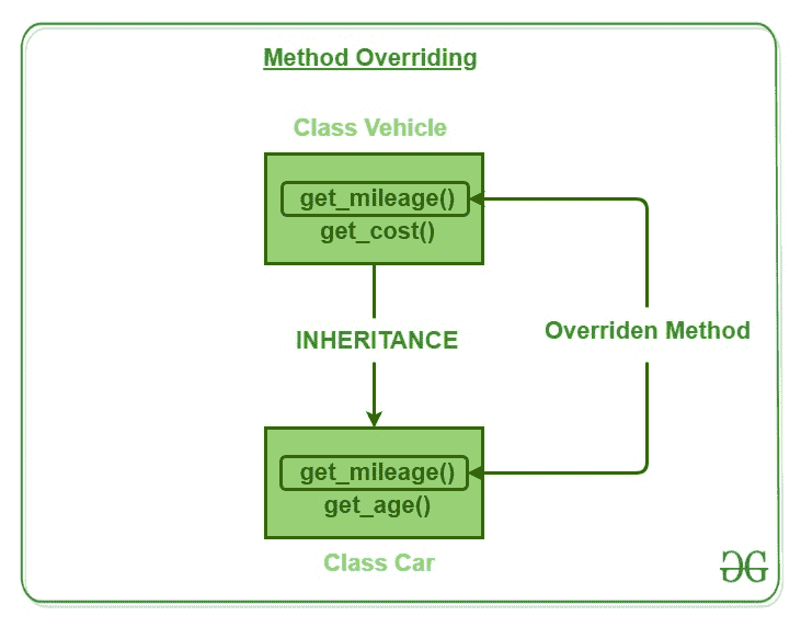 我们有一辆方法为get_mileage()和get_cost()的基础级车辆和方法为get_mileage()和get_age()的衍生级汽车。现在,由于两个类的方法之一具有相同的名称,因此它们的执行将基于方法覆盖概念的原则。让我们看看这个例子,看看它们是如何执行的。