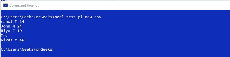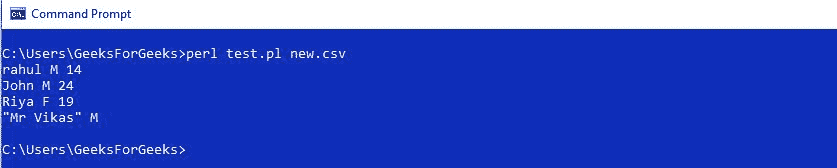 为了处理这种情况,一些限制和作用域被添加到 Perl 中,这些限制允许编译器跳过引号内的字段划分。 我们使用文本::CSV ,它允许完整的 CSV 阅读器和编写器。TEXT::CSV 是 Perl 中 MCPAN 的一个模块,它允许许多新的功能,例如读取、解析和写入 CSV 文件。这些模块可以包含在 Perl 程序中,使用以下 pragma: