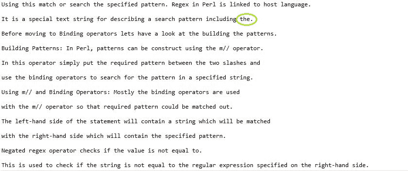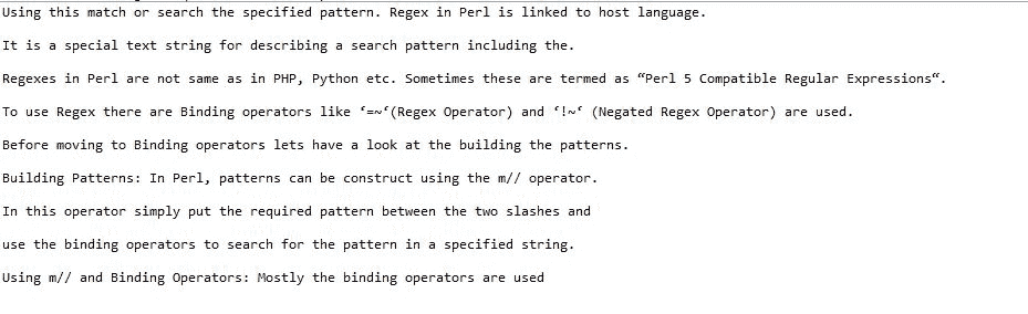 Regex 操作符有助于在文件中搜索特定的单词或一组单词。这可以根据用户的要求以多种方式完成。在 Perl 中搜索遵循的标准格式是,首先以读取模式打开文件,然后逐行进一步读取文件,然后在每行中查找所需的字符串或字符串组。当找到所需的匹配时,搜索表达式后面的语句将决定下一步如何处理匹配的字符串,它可以添加到用户指定的任何其他文件中,也可以简单地打印在控制台上。
