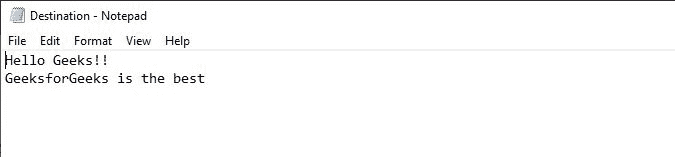 程序是这样工作的:- 第一步:以读模式打开两个文件 Source.txt,以写模式打开 Destination.txt。 步骤 2: 从 FHR 读取内容,FHR 是文件句柄读取内容,而 FHW 是文件句柄将内容写入文件。 第三步:使用打印功能复制内容。 步骤 4: 读取文件完成后,关闭 conn。